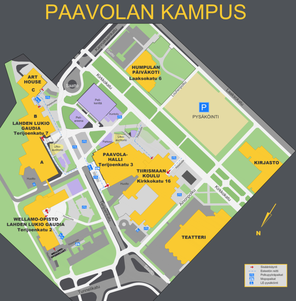 Paavolan kampuksella toimivat Humpulan päiväkoti, Lahden lukio Gaudia, Tiirismaan peruskoulu ja Wellamo-opisto sisältäen Taide- ja muotoilukoulu Taikan toiminnan, yhteensä 2500 lasta ja nuorta. Avoimien ovien iltapäivänä pääset kurkistamaan oppitunneille, tutustumaan näyttelyihin tai seuraamaan musiikkiesityksiä ja tanssiharjoituksia. Taidepolulla voit tutustua kampuksen taideteoksiin taiteilijoiden esittelemänä. Oppilaat ja opiskelijat toimivat kampusoppaina ja opastavat eri kohteisiin ja tapahtumiin.