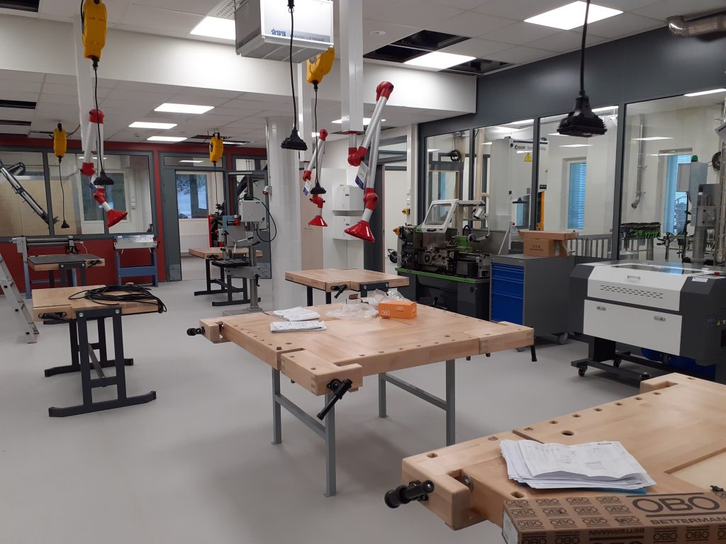 Käsityön kovien materiaalien oppimisympäristö on lohkon ensimmäisessä kerroksessa. Raskaiden työstökoneiden ja kalusteiden asennus on viimeistelyvaiheessa. Ensimmäisessä kerroksessa työstetään myös käsityön pehmeitä materiaaleja kovien materiaalien välittömässä läheisyydessä – vain lasiseinä erottaa tilat toisistaan.